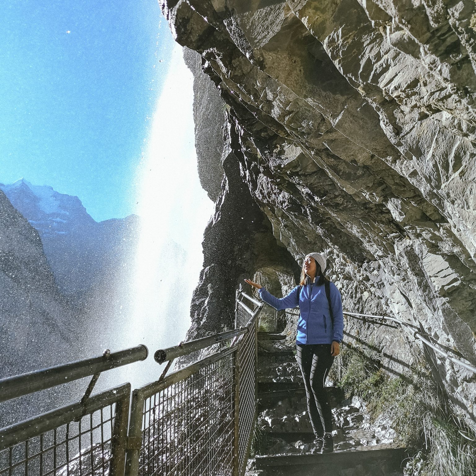 Staubbach Falls, located on the edge of town, is a short walk from any hotel based in the village. Once you’re at the base of the waterfall, start ascending the steps and trek up to the waterfall slowly. The terrain is a paved trail, but it’s on the steeper side so be cautious while trekking. The trail will also lead you right behind the waterfall and unveil a view of Lauterbrunnen and the valley through a curtain of misty falling water.