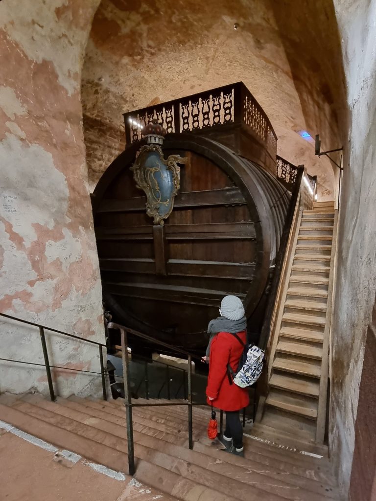An original Great Barrel holding 130,000litres of tithe wine fell victim to the turmoil of the Thirty Years’ War. In 1664, it was replaced by an even larger barrel with 200,000 liters capacity. Nearly 100 years later, Prince‑Elector Carl Theodor, who had long since taken up residence in Mannheim Palace, had the third and current Great Barrel constructed. 220,000 liters of wine were stored here. An interesting detail of the barrel is a staircase that leads to a platform above the barrel which was likely used as a dance floor.